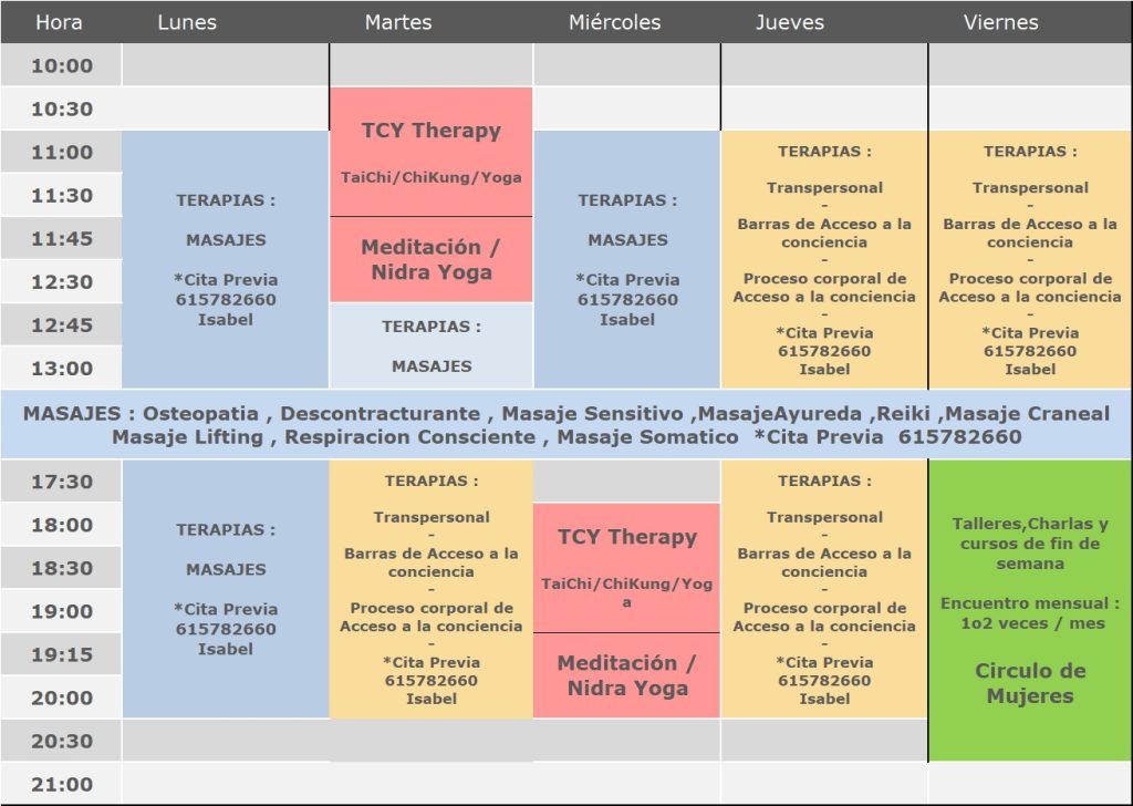 Horario Clases / Precios TCY Therapy : Clase terapéutica que combina la esencia y beneficios del Chi Kung , Tai Chi , Yoga, Meditación, Nidra Yoga. (2 horas) Una sesión semanal 20 euros/mes Clases sueltas ( 8 euros) Una sesión semanal 40 Euros / mes Clases sueltas ( 15 € ) Clases de meditación/ Nidra Yoga (45 minutos) : Una sesión semanal 20 euros/mes Clases sueltas ( 8 euros)